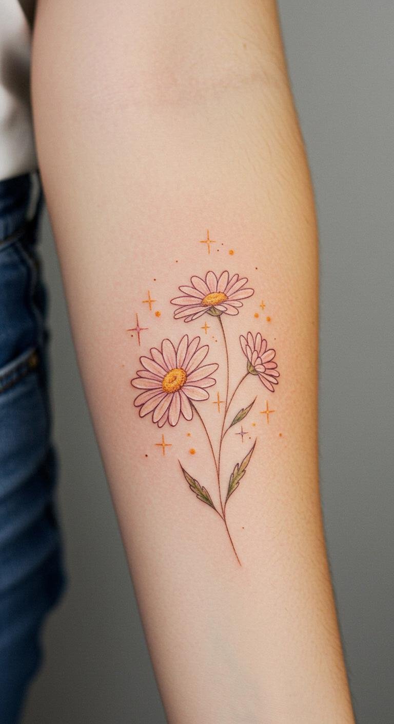 This tattoo symbolizes purity and new beginnings through the daisy, while the stars represent aspirations and dreams.
