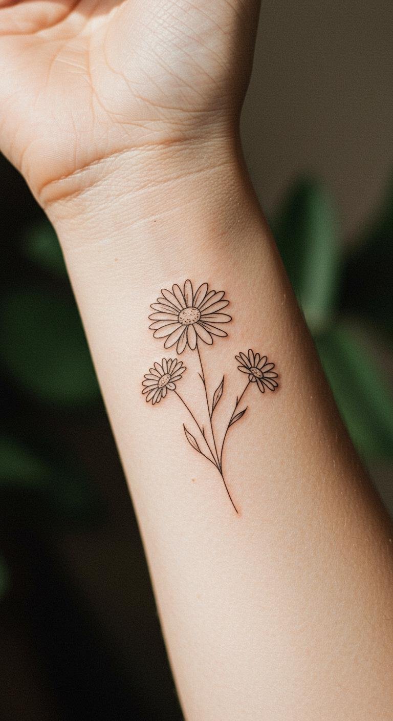 The cluster of fine line daisies symbolizes purity and new beginnings, making this tattoo a meaningful representation of one’s journey.