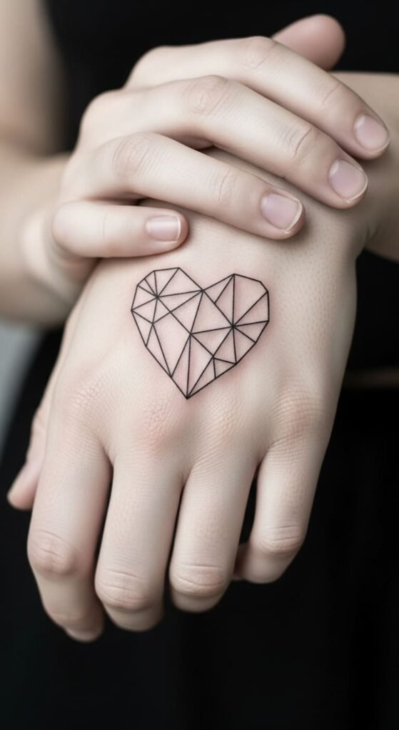 Geometric Heart Fine Line Hand Tattoo