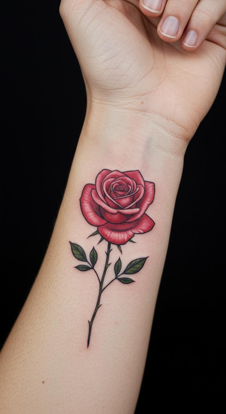 This tattoo design captures the essence of love and passion, symbolized by the rose’s intricate lines and soft hues.