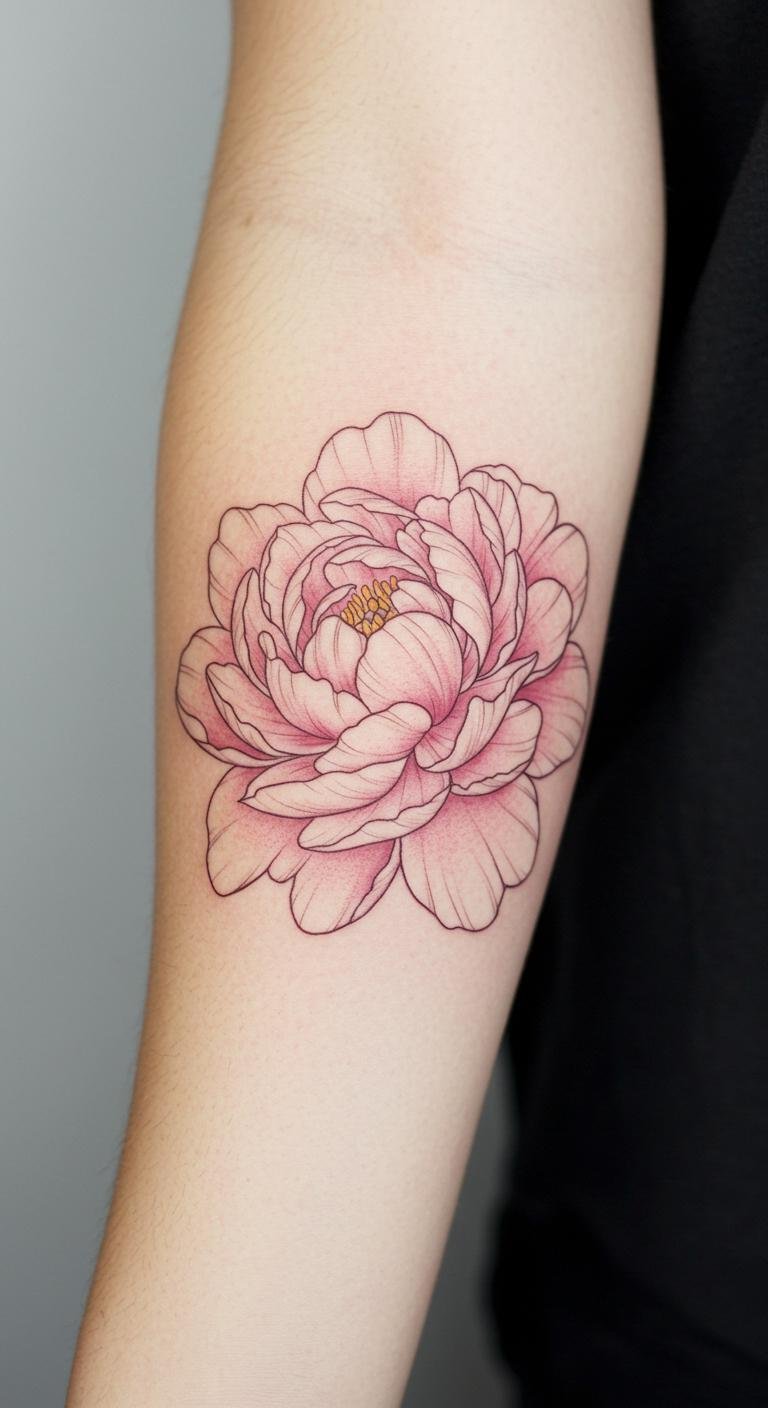 This tattoo design embodies the peony’s symbolism of love, honor, and beauty, perfectly complementing the wearer’s individuality.