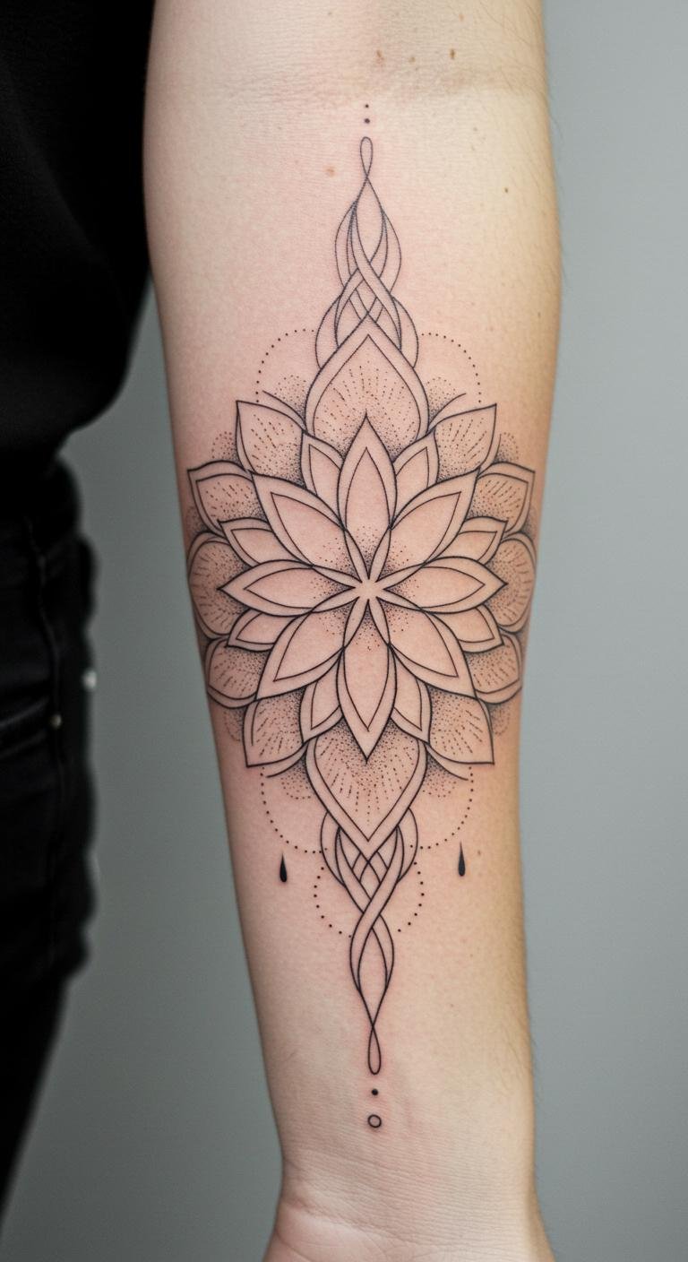 This mandala fine line tattoo on the forearm symbolizes harmony and unity, inviting the wearer to embrace their individuality.