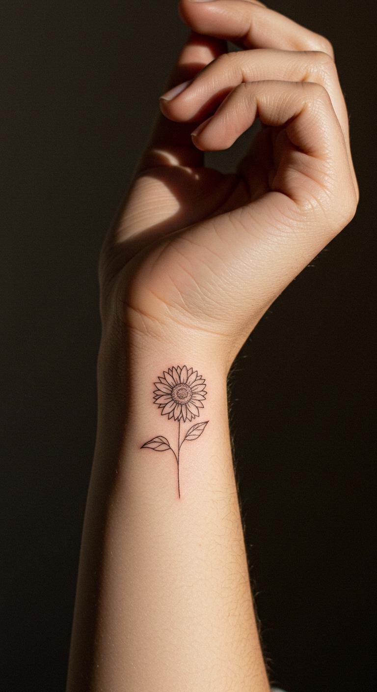 The tiny sunflower tattoo symbolizes positivity and warmth, embodying joy and resilience in the face of life’s challenges.