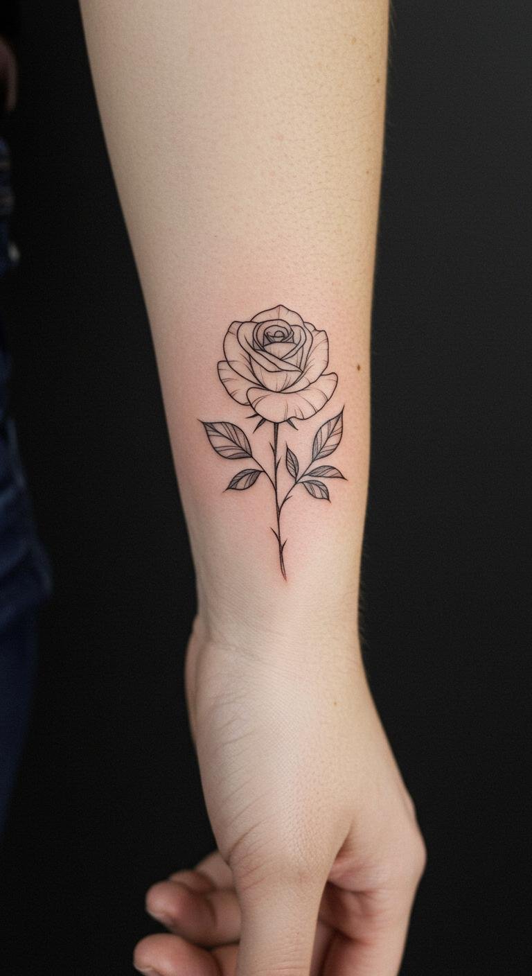 The delicate lines capture rose symbolism, representing love and passion, while the strategic tattoo placement enhances your natural grace.