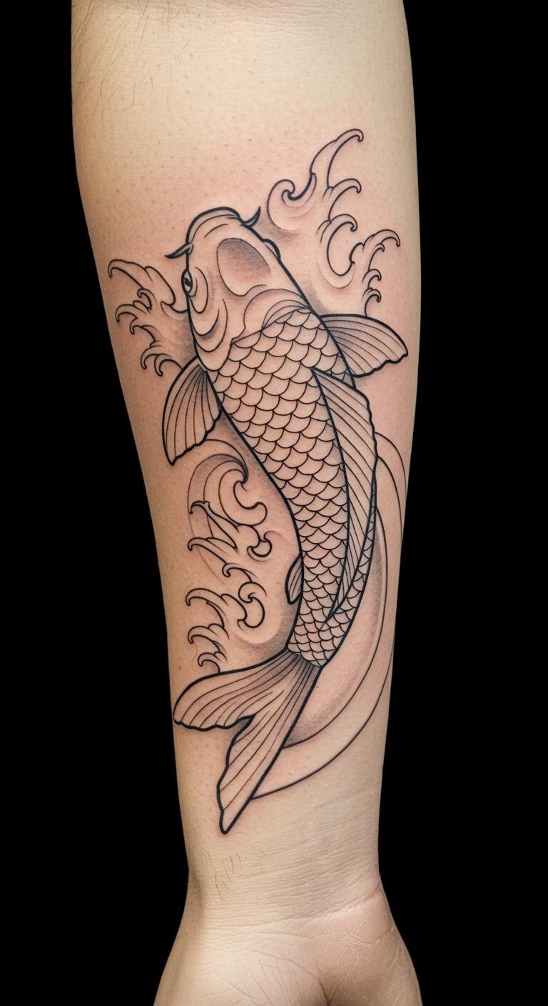 The Koi Fish tattoo represents strength, resilience, and the journey of life, symbolizing the ability to overcome obstacles.