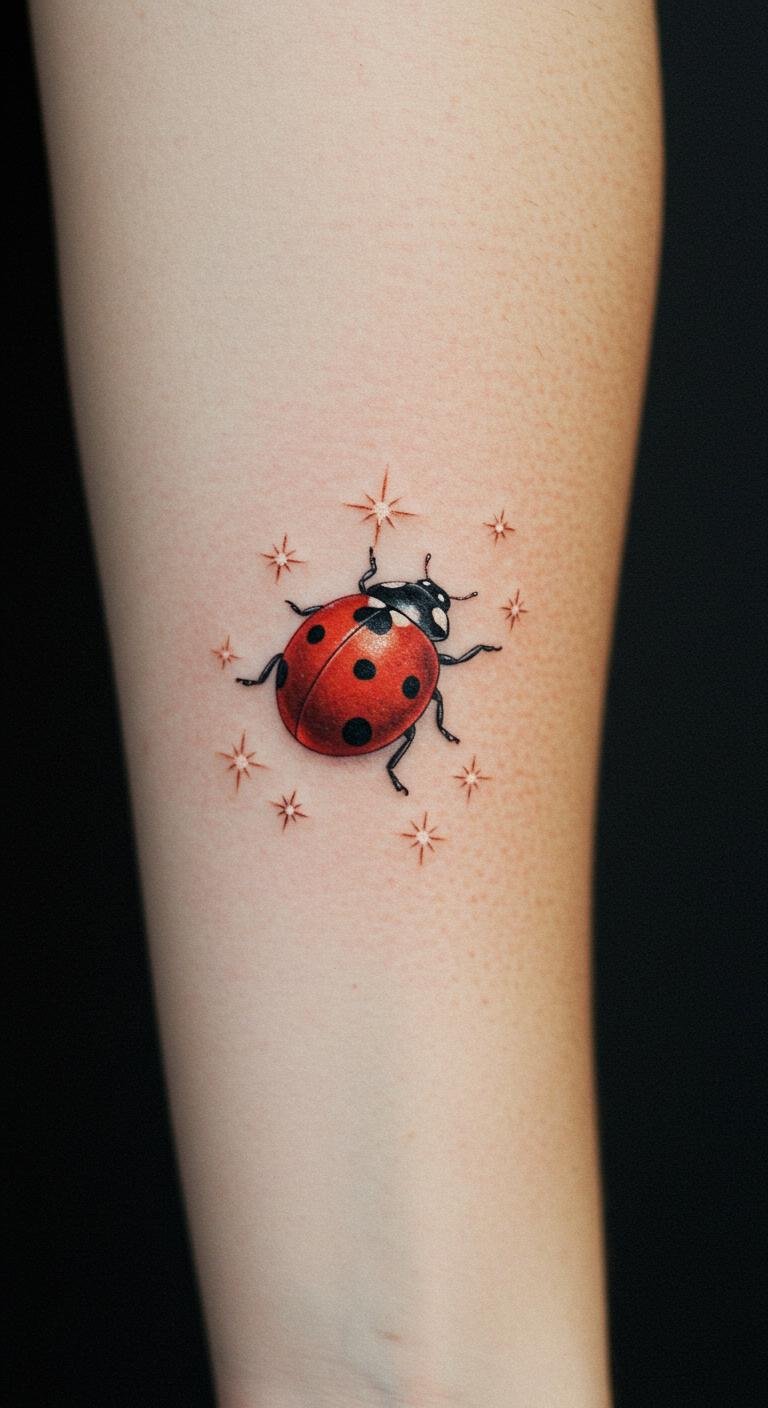 This tattoo symbolizes good luck and the pursuit of dreams, with the ladybug representing fortune and the stars embodying aspirations.
