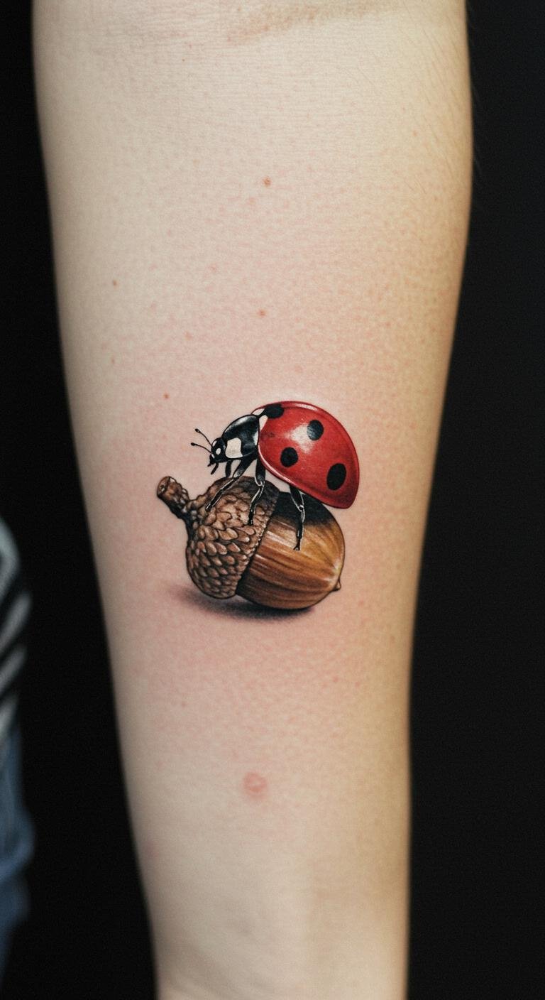 This tattoo beautifully symbolizes growth and transformation, as the acorn represents potential and new beginnings, while the ladybug signifies good luck and joy.