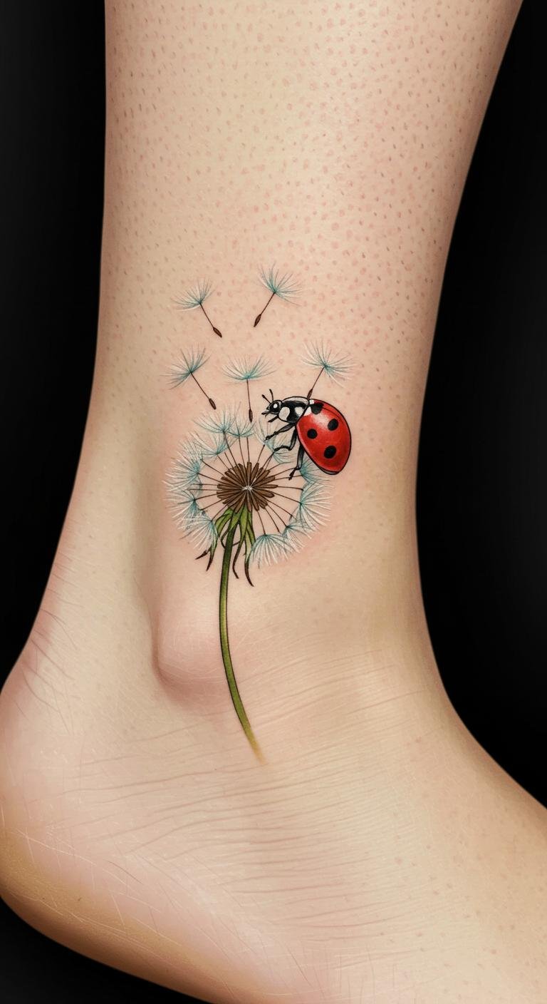 Ladybug and Dandelion Fine Line Ankle Tattoo