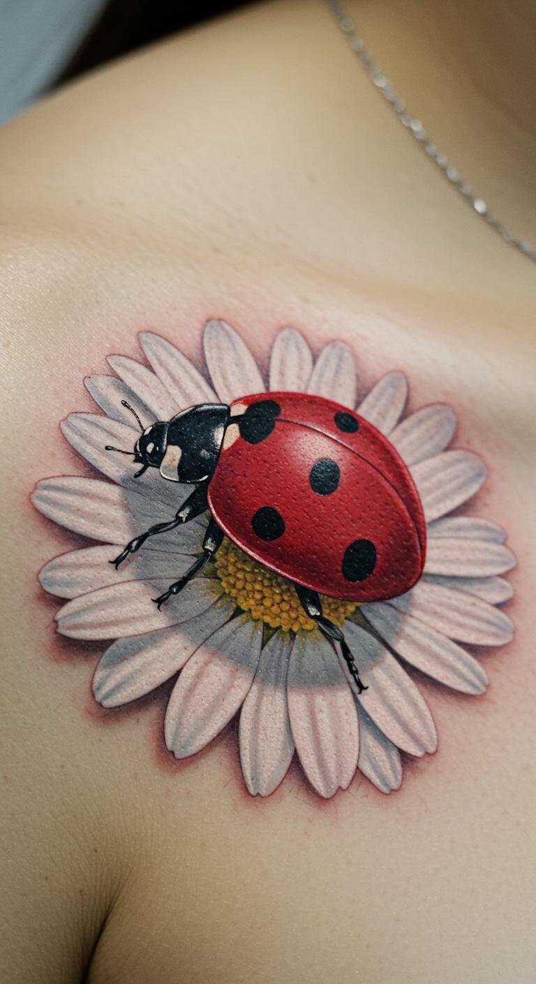 Ladybug and Daisy Fine Line Shoulder Tattoo