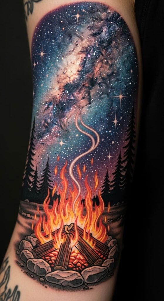 The starry night sky adds an element of wonder, inviting reflection on life’s adventures. Positioned on the forearm, it serves as a constant reminder to embrace the magic of the outdoors and the bonds formed around a fire beneath the stars.