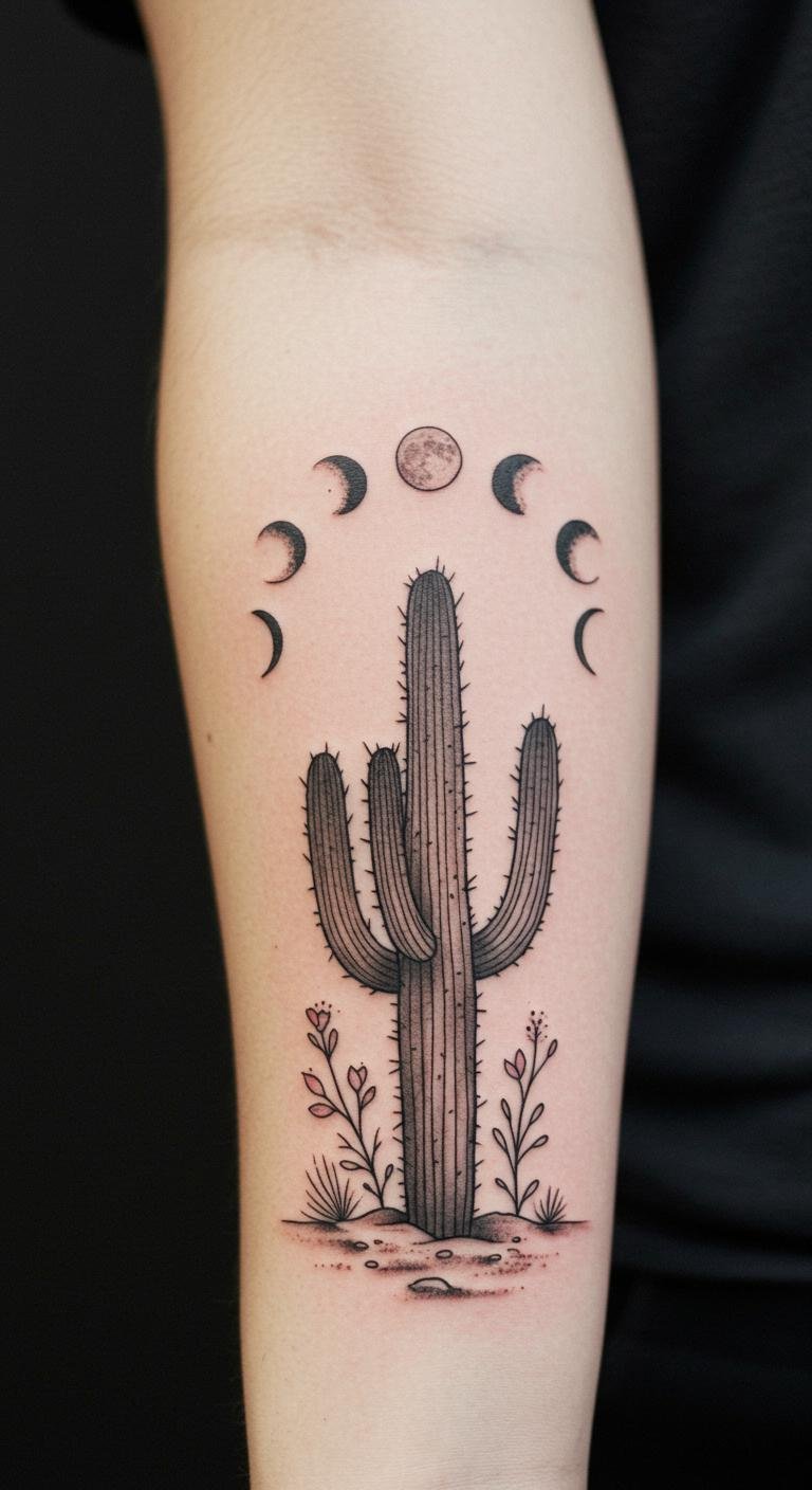 This tattoo symbolizes endurance and resilience, reflecting the cactus’s ability to thrive in harsh environments. The crescent moon adds a touch of celestial beauty, representing intuition and dreams.