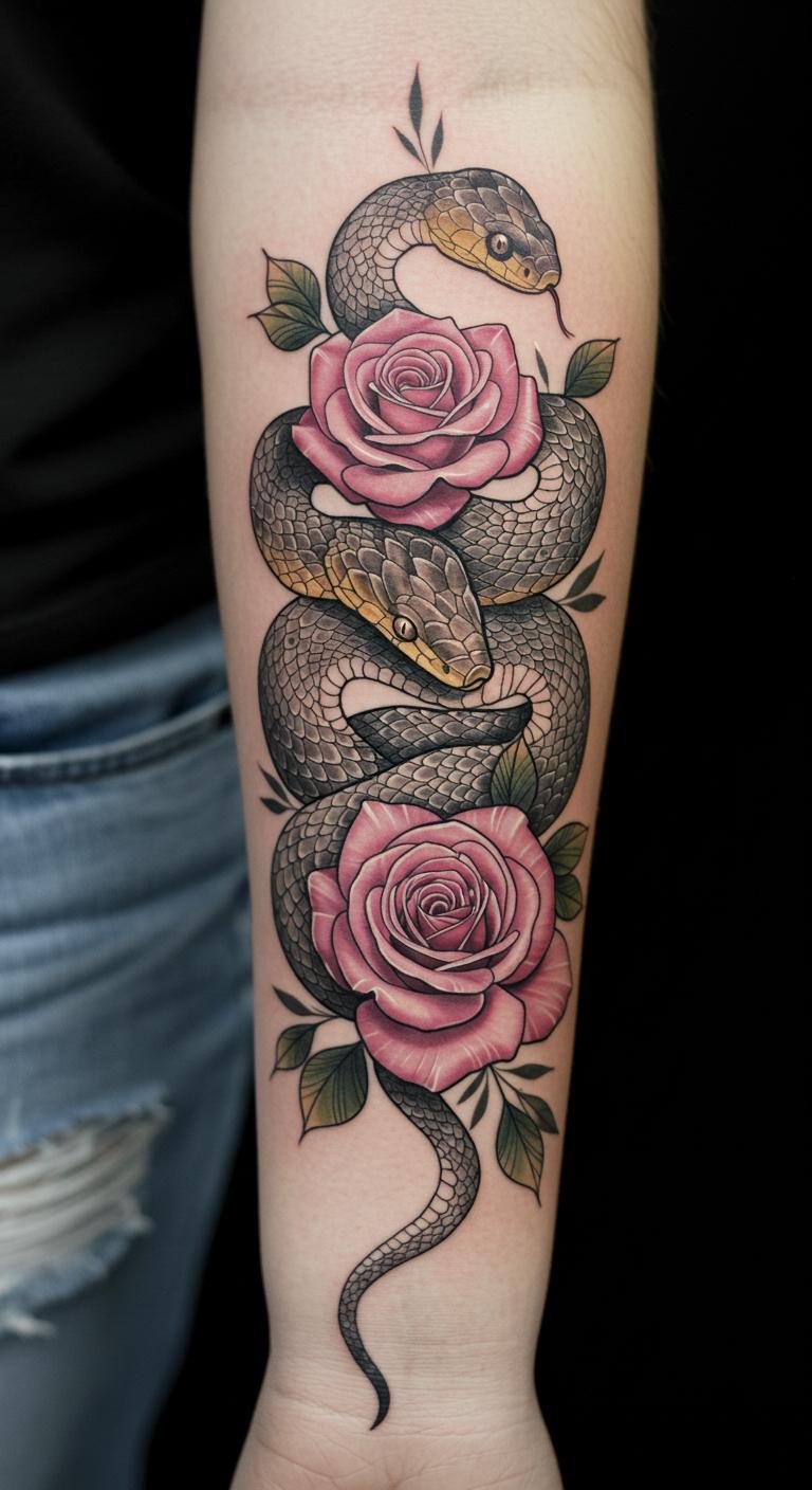 This tattoo design symbolizes the intertwining of danger and beauty, with the snake representing transformation and rebirth, while the roses embody love and passion.