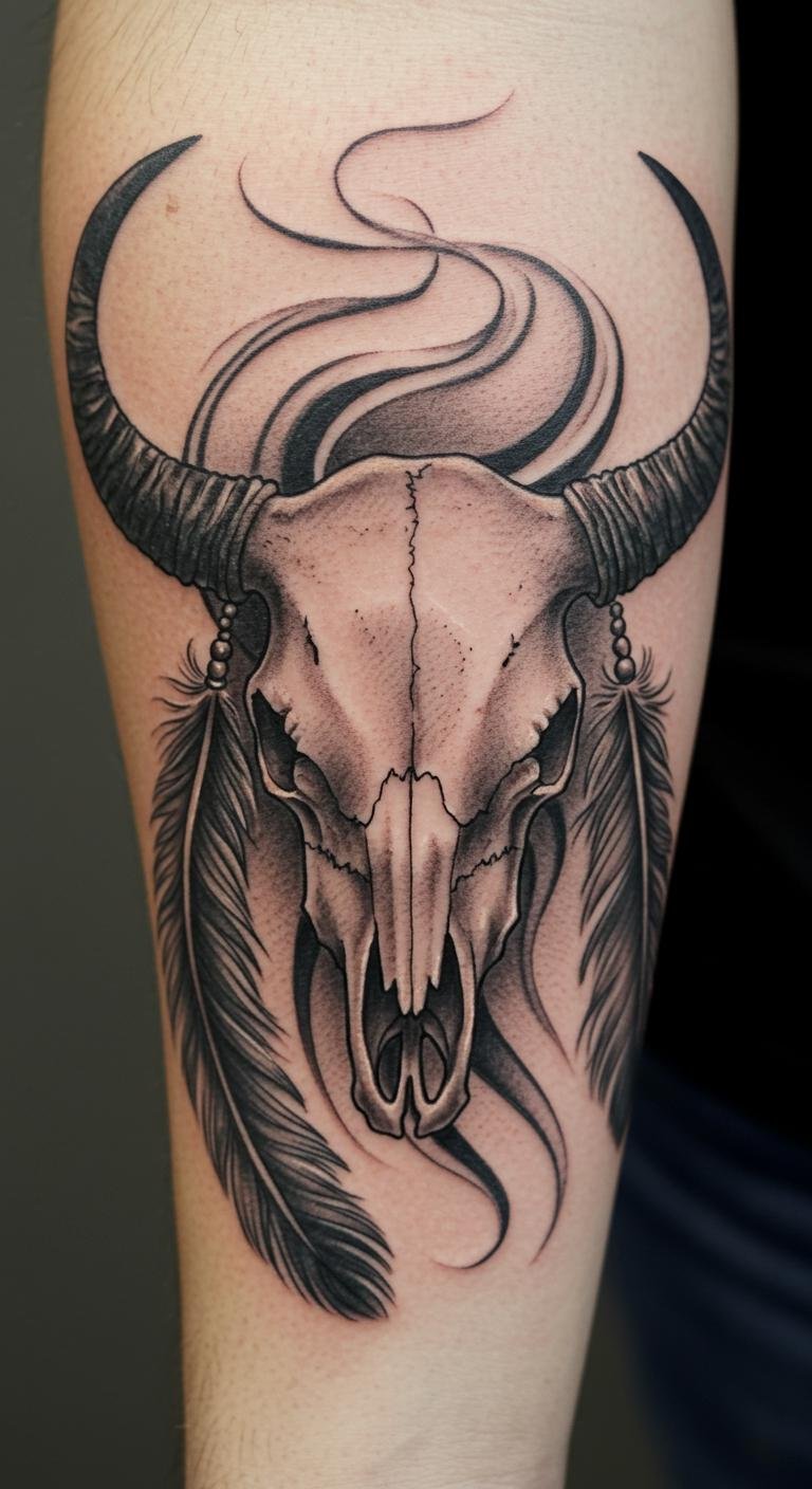This Bull Skull and Feathers Tattoo symbolizes strength and resilience, deeply rooted in Western heritage. The bull skull represents power and endurance, while the feathers signify a connection to nature and freedom.