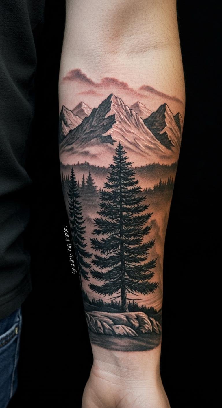 This tattoo symbolizes the spirit of the Wild West, representing freedom, adventure, and a deep-rooted connection to nature. The rugged mountains embody strength and resilience, while the floral elements add a touch of grace and beauty, reflecting the balance of ruggedness and elegance in life’s journey. Placed on the forearm, this design invites personal reflection and serves as a reminder to embrace one’s wanderlust and the call of the wild.