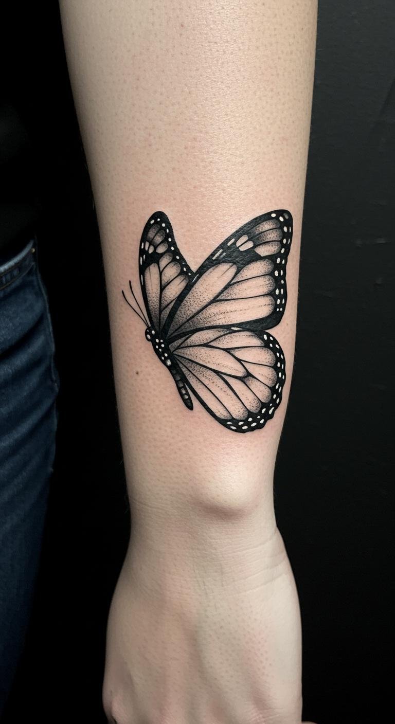 This black butterfly tattoo on the wrist symbolizes freedom and transformation, serving as a daily reminder of resilience and beauty.