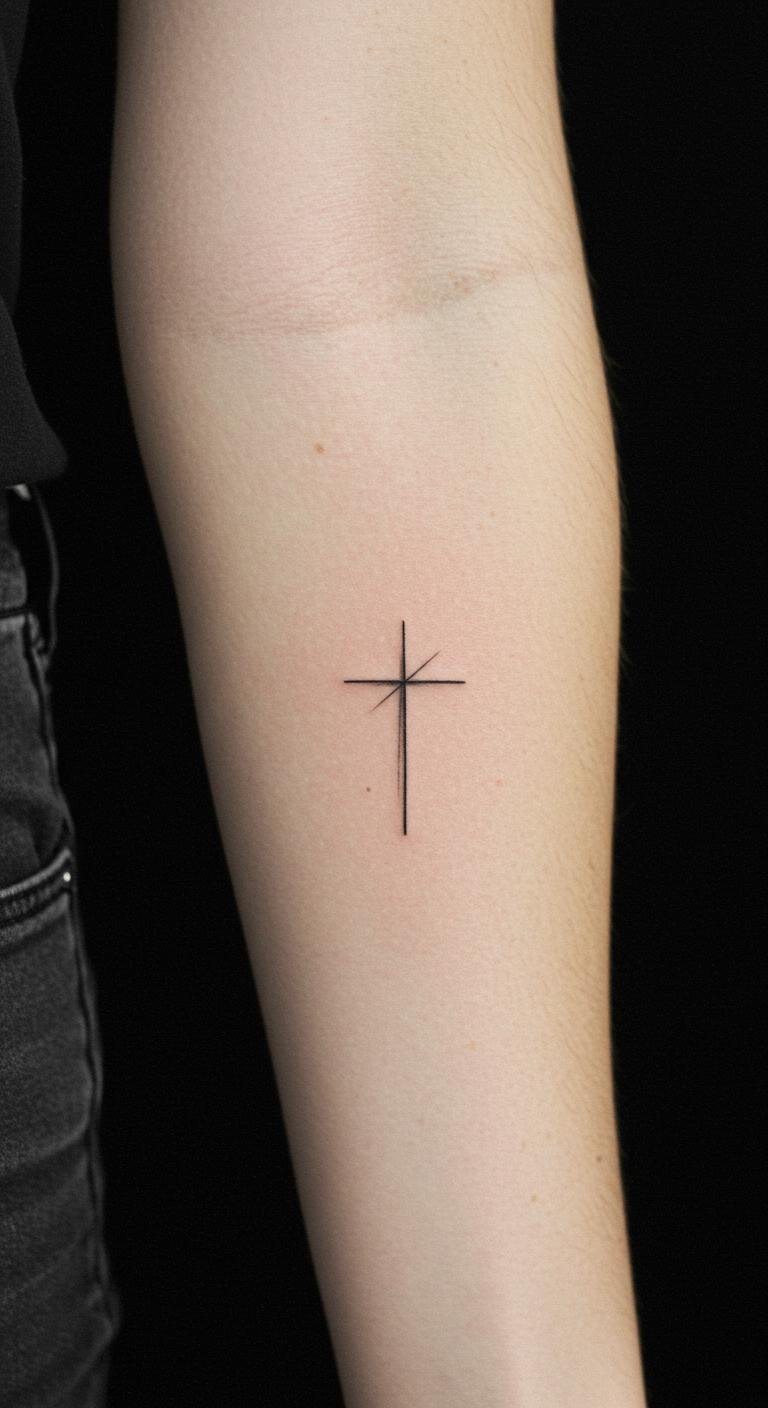 This simple cross tattoo on the inner forearm symbolizes a deep connection to one’s beliefs and serves as a constant reminder of faith and resilience.