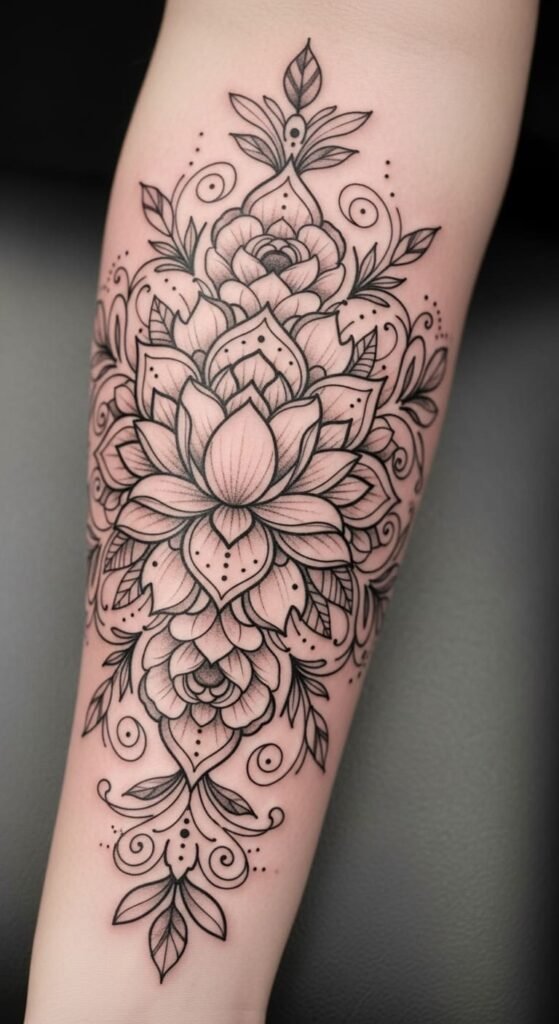 This floral mandala tattoo symbolizes balance and harmony, essential elements in one’s life journey.