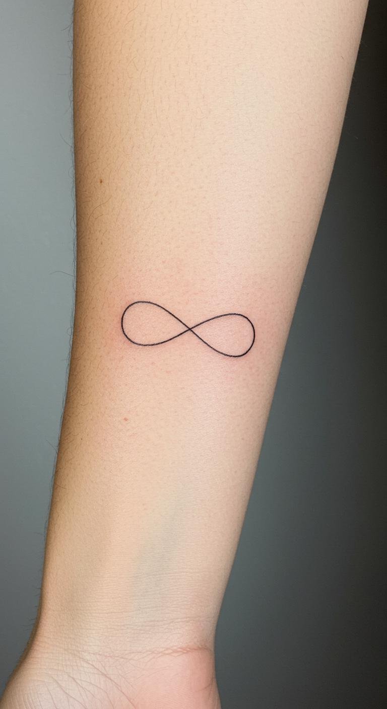 This minimalist infinity symbol tattoo represents the concept of eternity and endless possibilities, serving as a constant reminder of personal growth and freedom.