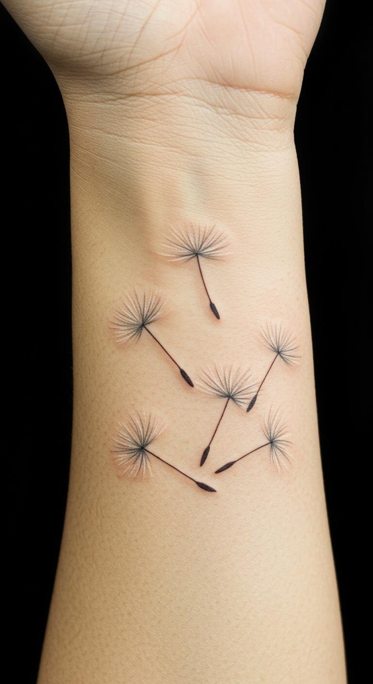 This enchanting dandelion seed tattoo on the wrist symbolizes the beauty of wishes and the transient nature of life.