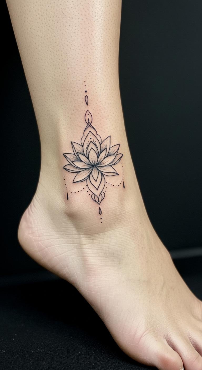 The elegant lotus ankle tattoo symbolizes growth and purity, serving as a powerful reminder of one’s journey toward enlightenment and freedom.