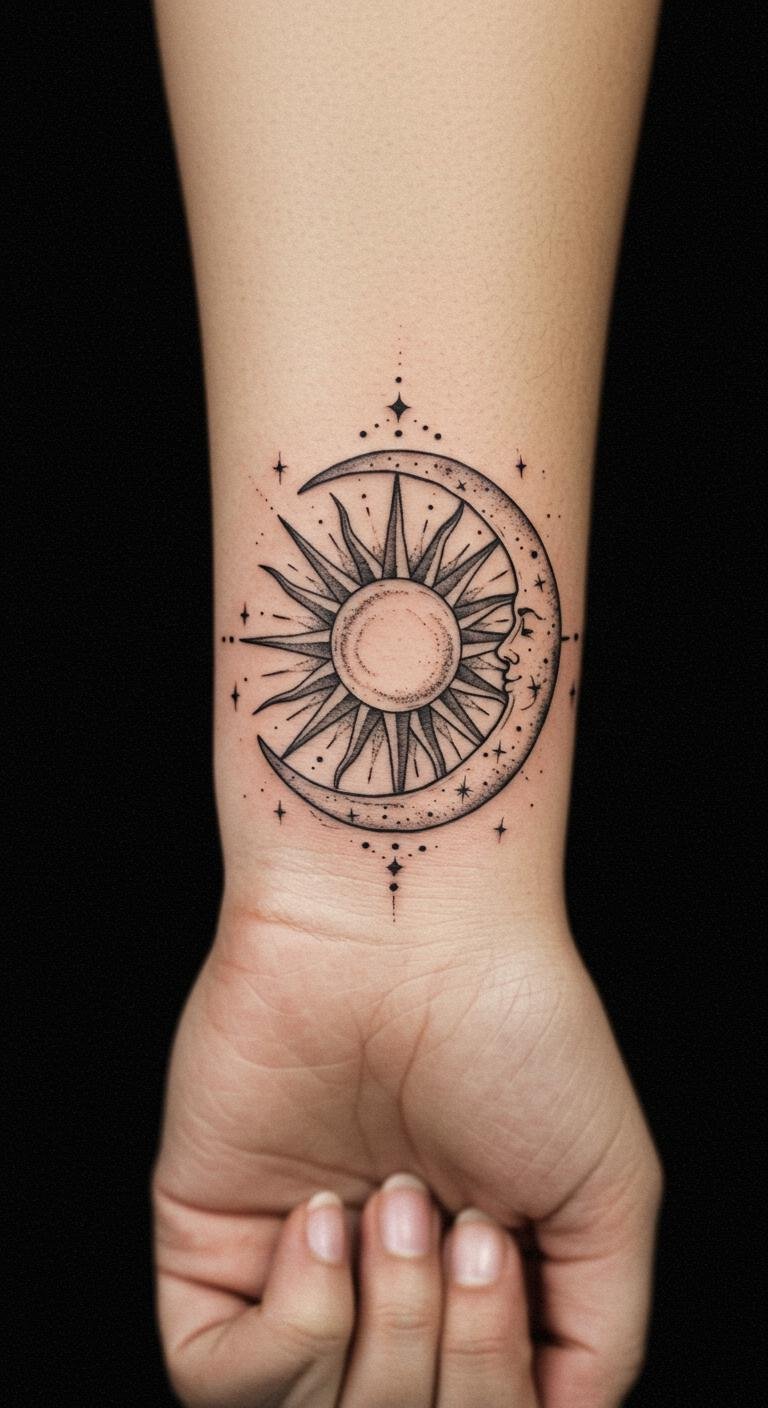 The celestial moon and stars tattoo on the wrist symbolizes a deep connection to the universe and its mysteries.