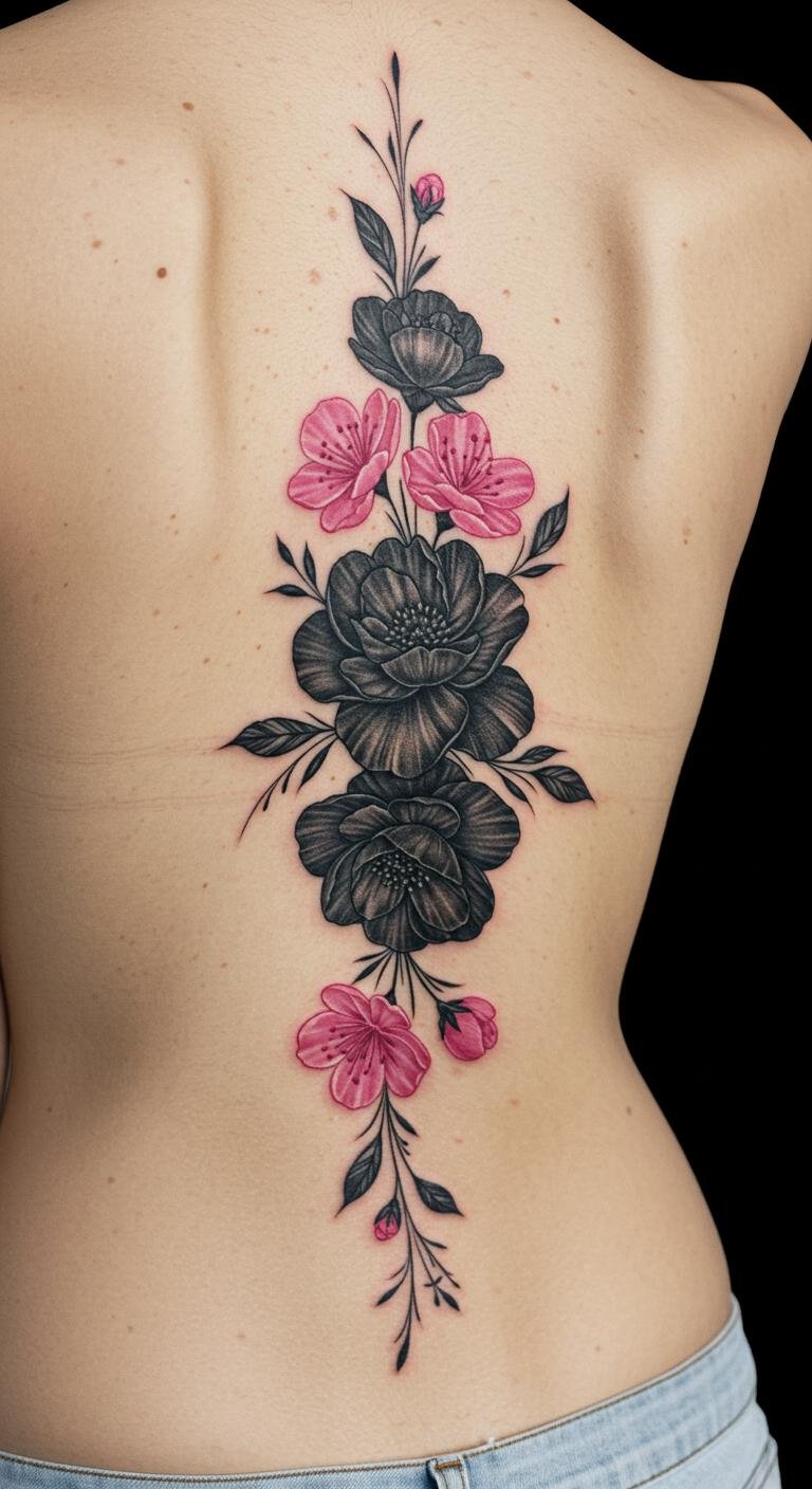 The floral spine tattoo symbolizes femininity, strength, and personal growth, reflecting the wearer’s journey and individuality.