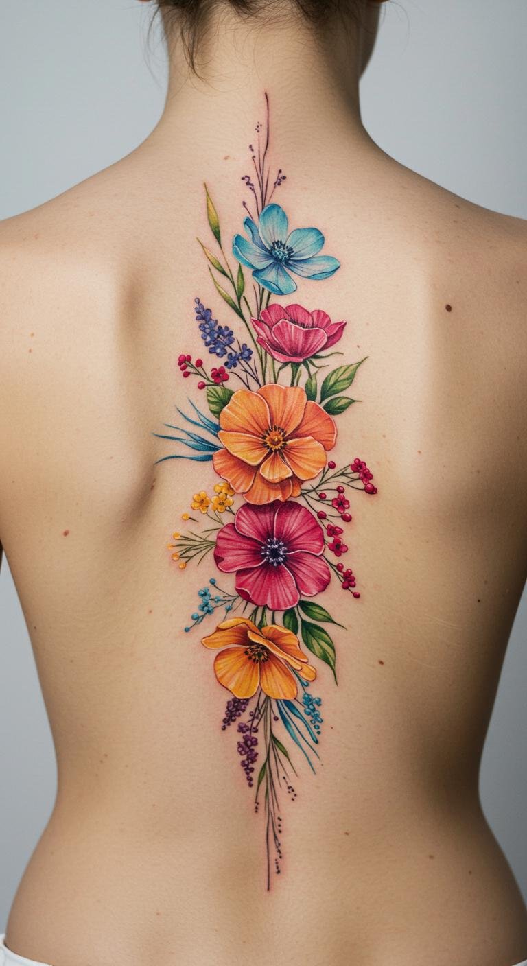 Each flower in this tattoo carries deep symbolism: lavender represents tranquility and calmness, sunflowers symbolize adoration and loyalty, while cherry blossoms embody the beauty of fleeting moments and renewal. Placed along the spine, this design not only enhances the natural curves of the body but also serves as a reminder of resilience and personal growth. It transforms the back into a meaningful canvas, inviting onlookers to appreciate the story woven into the floral patterns.