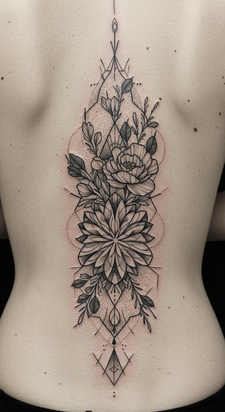 Placed along the spine, this design draws attention to the body’s natural lines, making it an eye-catching feature. The choice of this area emphasizes both elegance and femininity, allowing the wearer to express their love for nature and personal growth.