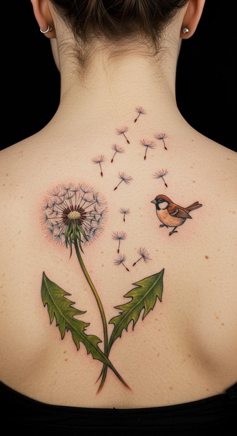 This tattoo embodies a whimsical journey, with the dandelion seeds representing hope and the beauty of letting go, while the sparrow symbolizes freedom and loyalty.