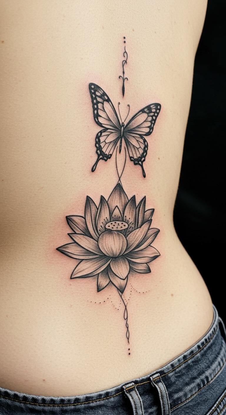 The Lotus and Butterfly Spine Tattoo carries deep symbolism, representing purity, rebirth, transformation, and freedom.