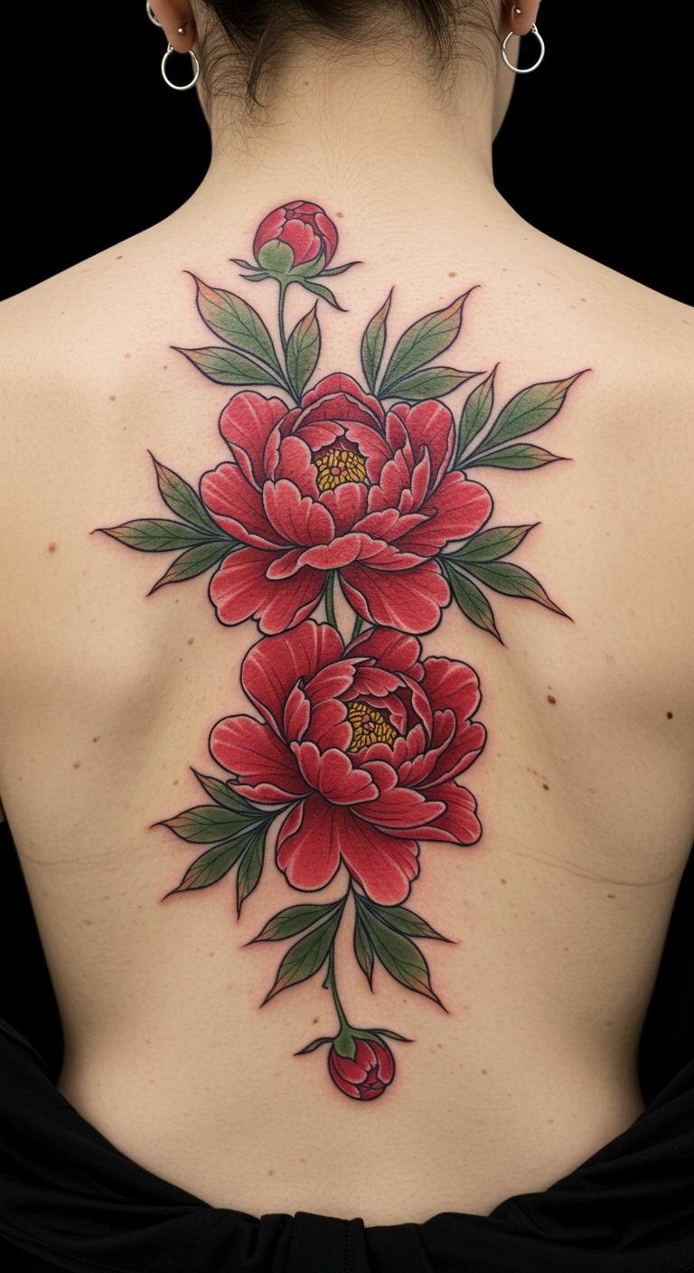 The Bold Peony Spine Tattoo not only captivates the eye but also embodies deep symbolism.