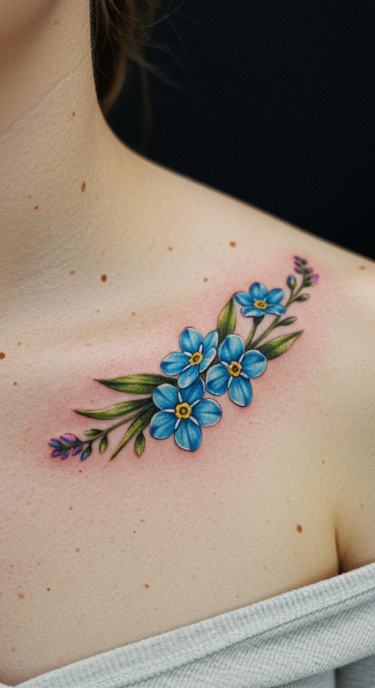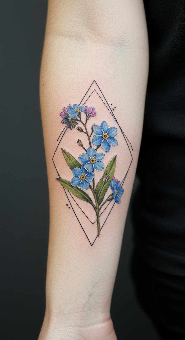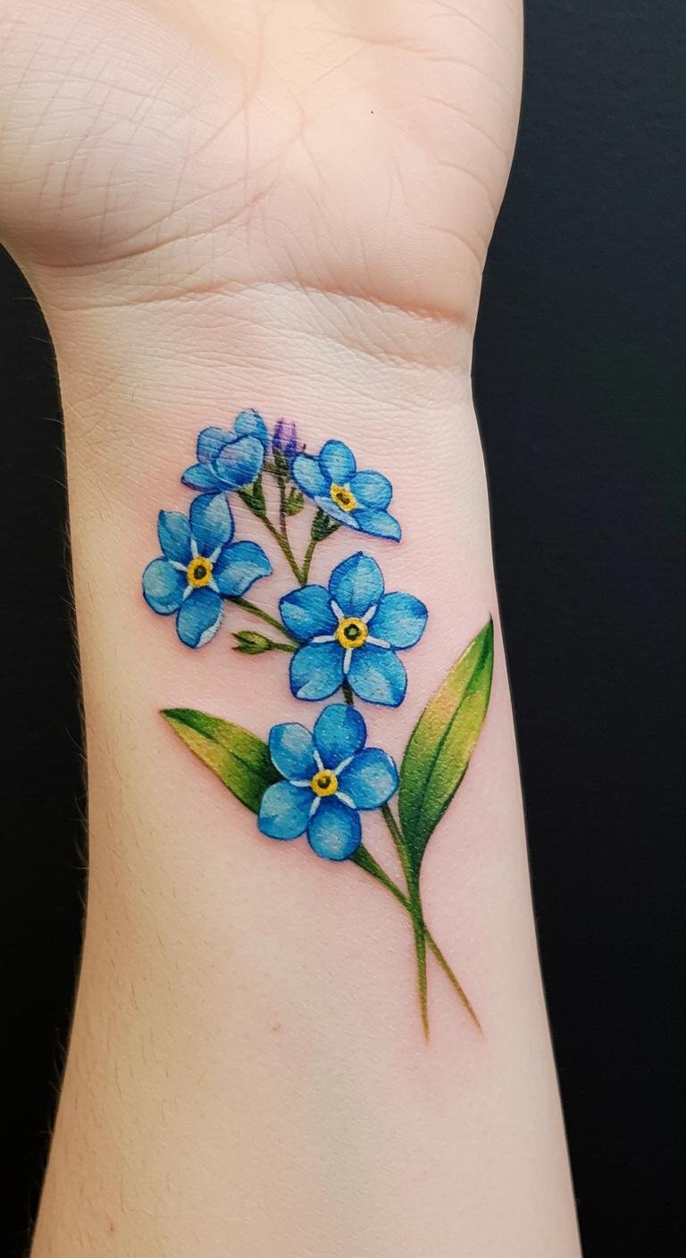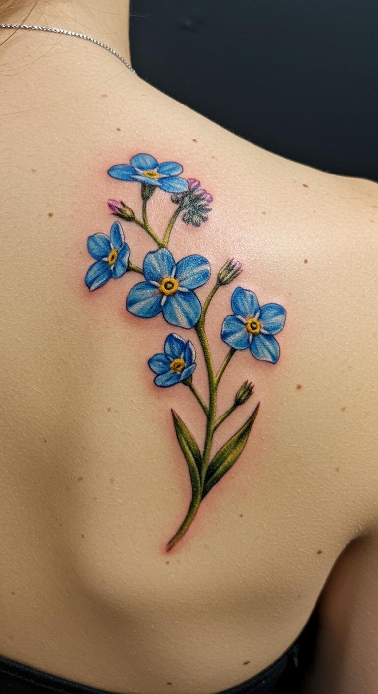 This forget-me-not tattoo symbolizes enduring love and cherished memories, making it a deeply personal piece of art.