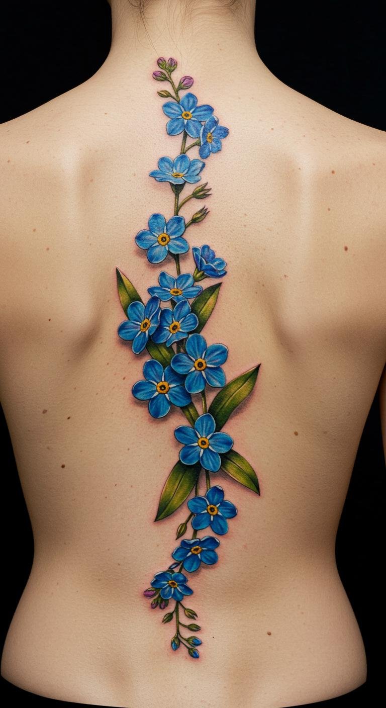 This Elegant Forget-Me-Not Spine Tattoo beautifully symbolizes love and cherished memories, embodying grace and individuality.