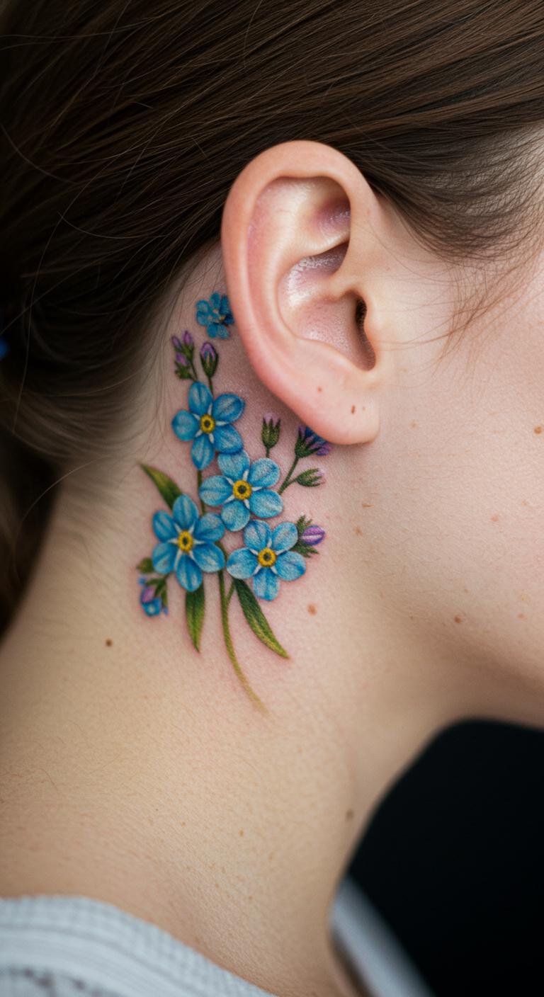 Nestled behind the ear, this forget-me-not tattoo becomes an intimate expression of love and remembrance, whispering secrets of the heart.