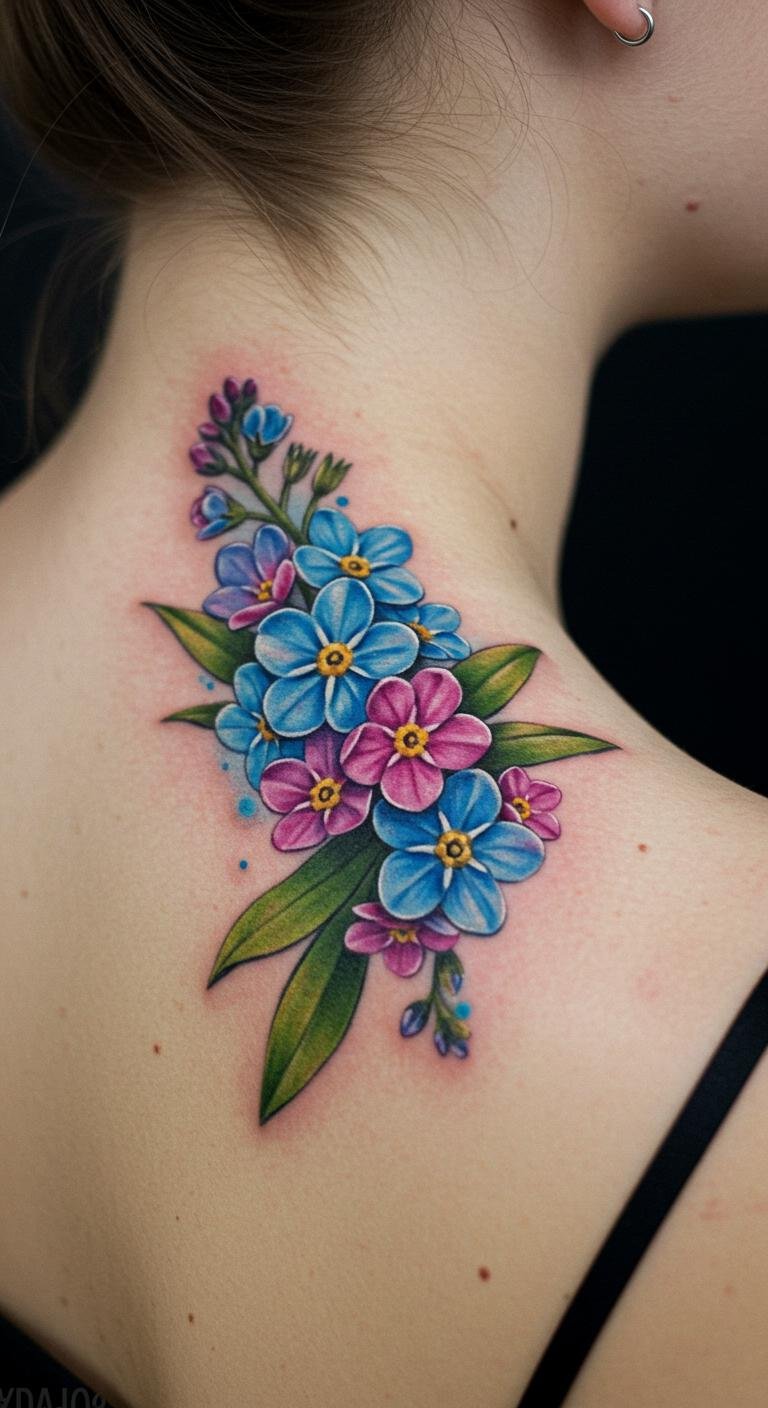 This stunning placement along the upper back allows for a graceful display of the forget-me-not’s beauty, symbolizing love, remembrance, and cherished memories.
