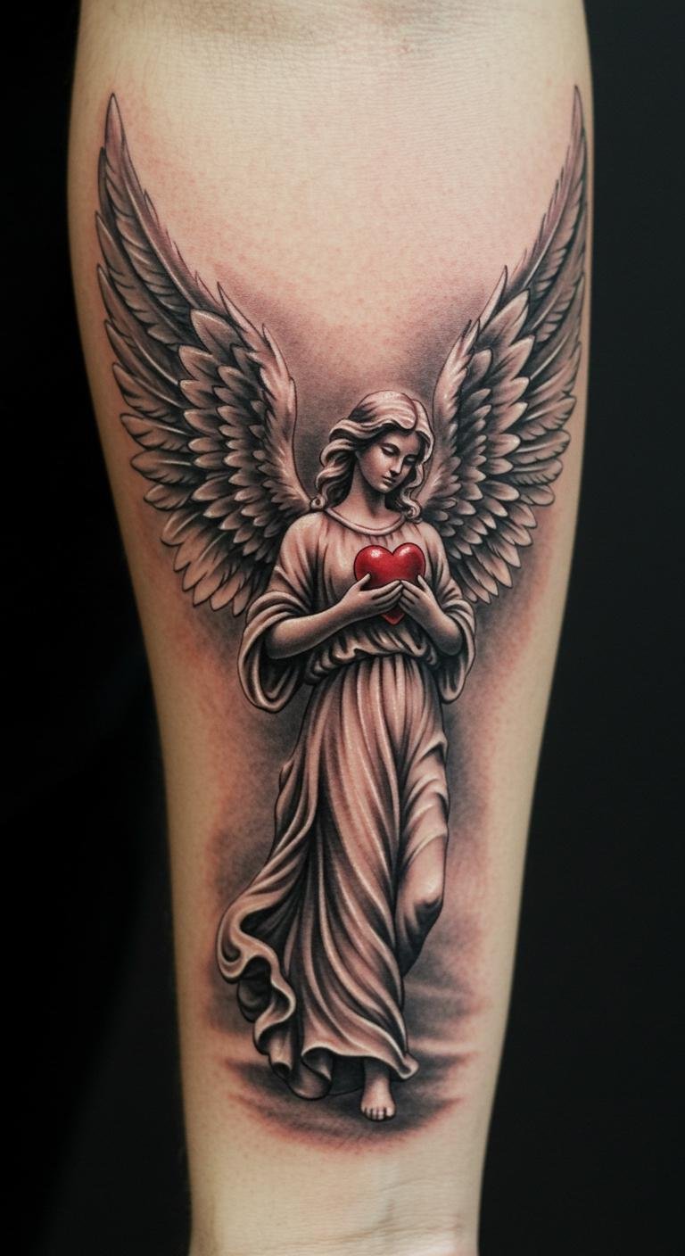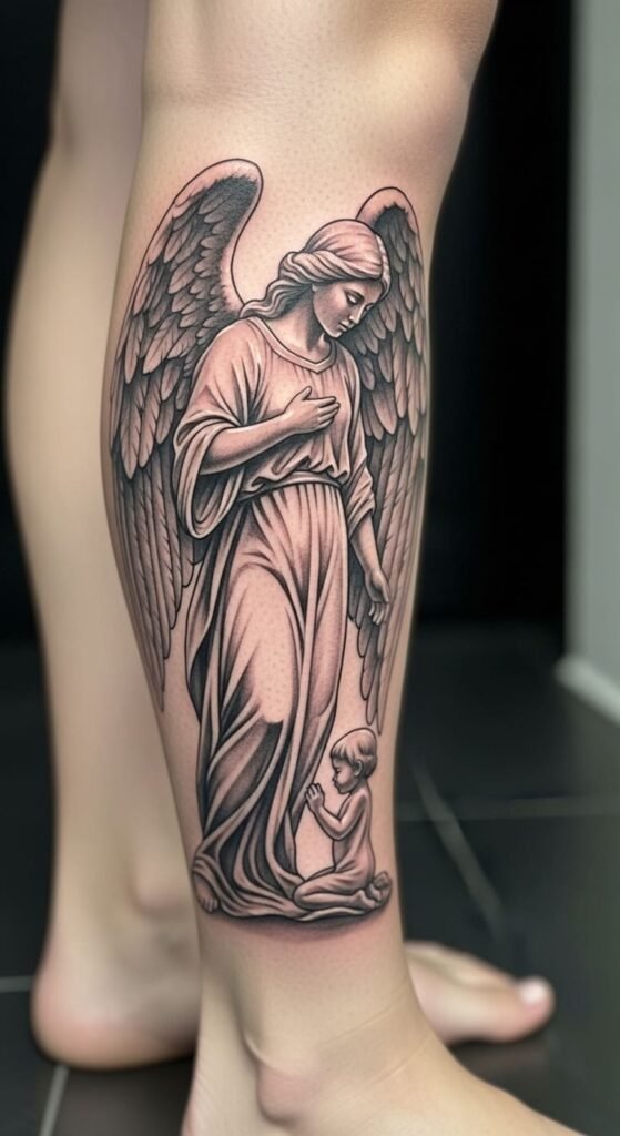 This guardian angel tattoo serves as a powerful reminder of the protection and guidance that surround you, embodying a deep personal significance.