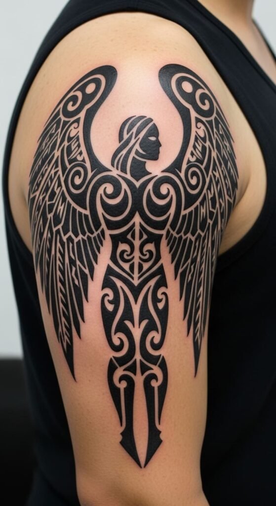 This guardian angel tribal tattoo symbolizes protection and guidance, embodying a powerful connection to one’s spiritual journey.