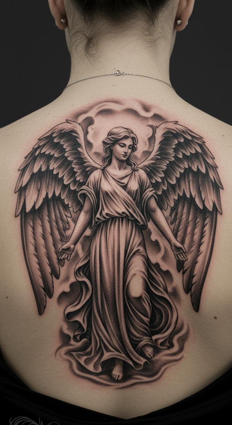 This guardian angel tattoo symbolizes protection, guidance, and personal strength, beautifully adorning the upper back where it can be both visible and personal.