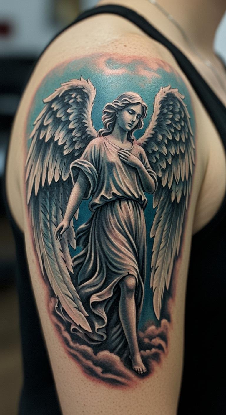 This guardian angel tattoo symbolizes strength and protection, serving as a powerful reminder of divine guidance.