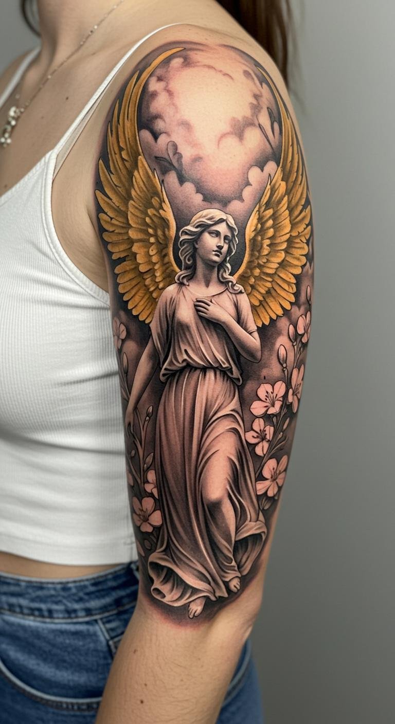 The Guardian Angel tattoo serves as a powerful symbol of grace and divine protection. Placed on the upper arm, it elegantly enhances the body’s contours while embodying a sense of strength and guidance.