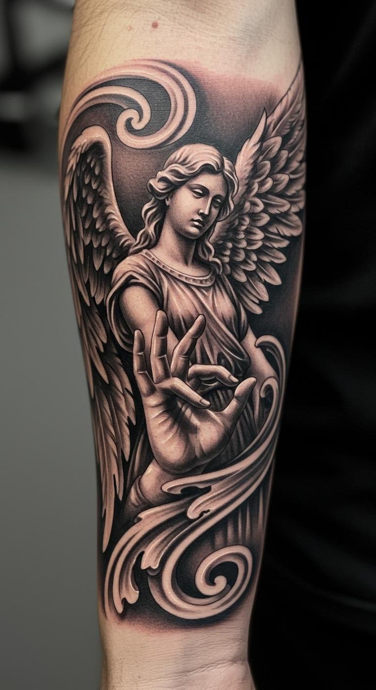 The guardian angel tattoo, placed on the forearm, serves as a constant reminder of protection and support throughout life’s journey.