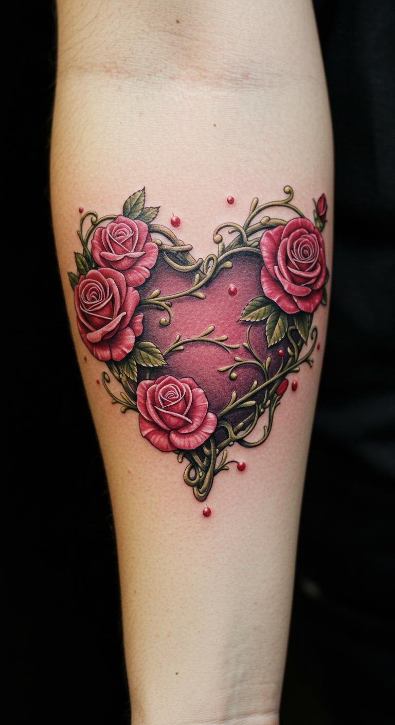 This Floral Heart and Roses Tattoo represents a deep connection to nature and love, with each rose symbolizing passion and beauty.