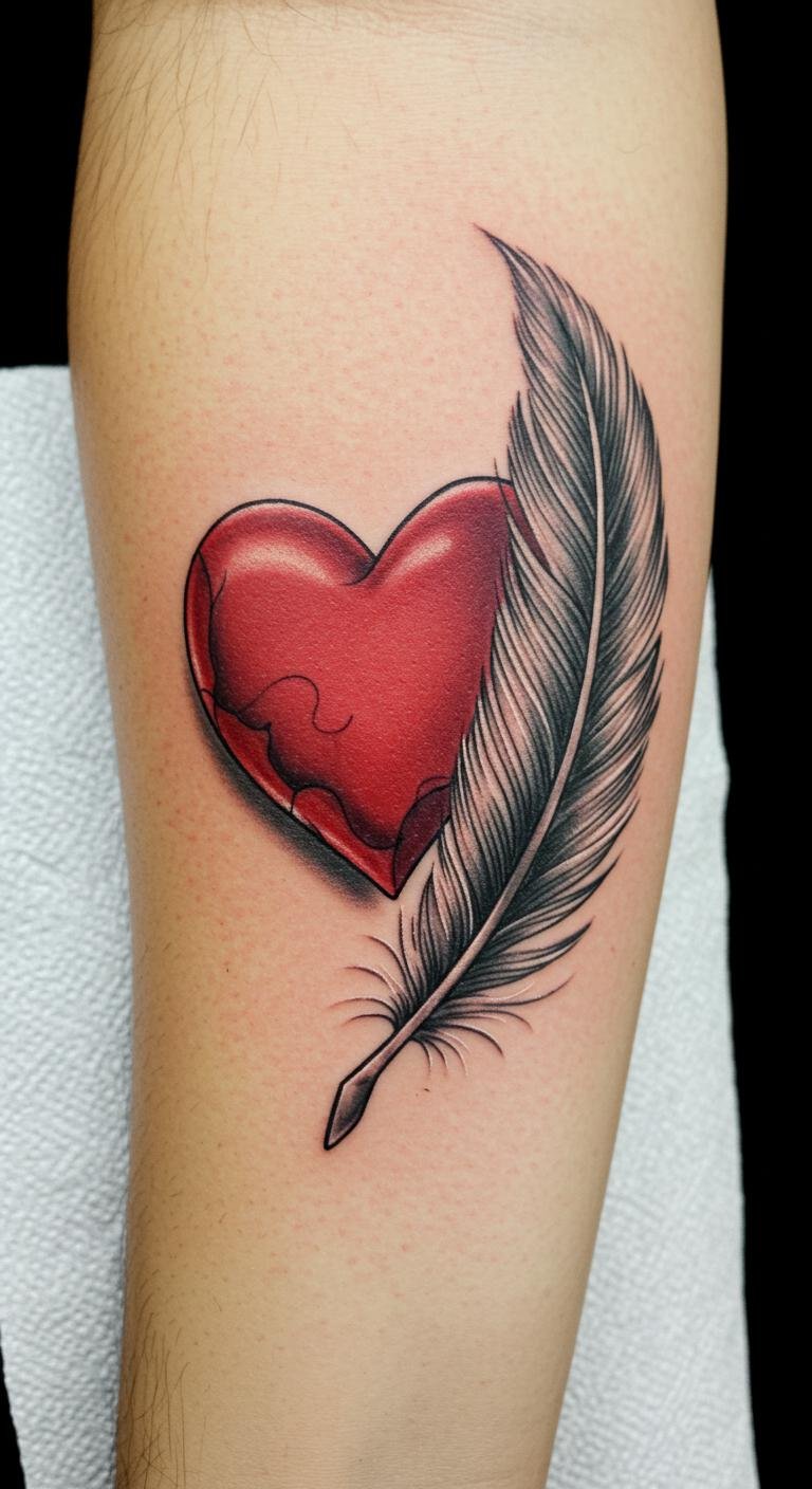 This heart and feather tattoo, placed on the forearm, symbolizes the intertwining of love and freedom, serving as a constant reminder of the wearer’s passion and quest for liberation.