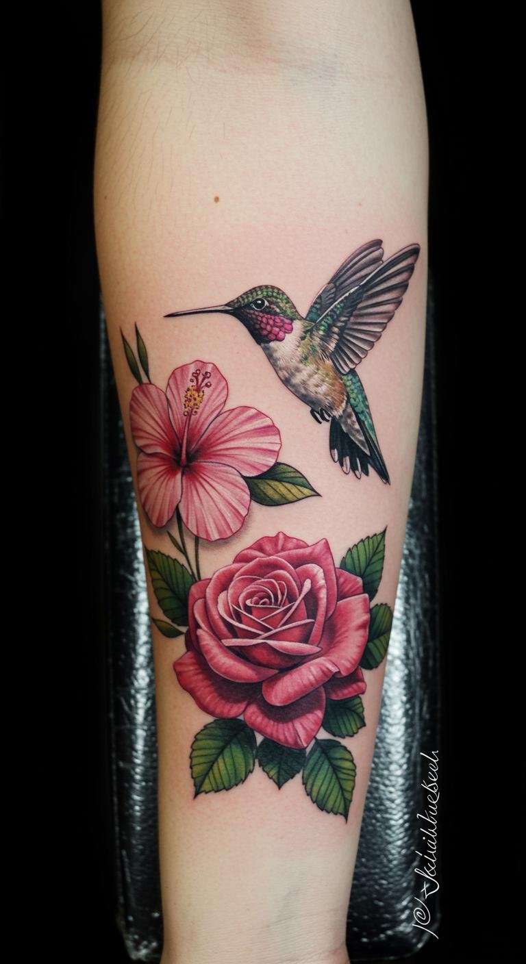 This tattoo design symbolizes the beauty of love and joy through the combination of the hummingbird with a rose and hibiscus.