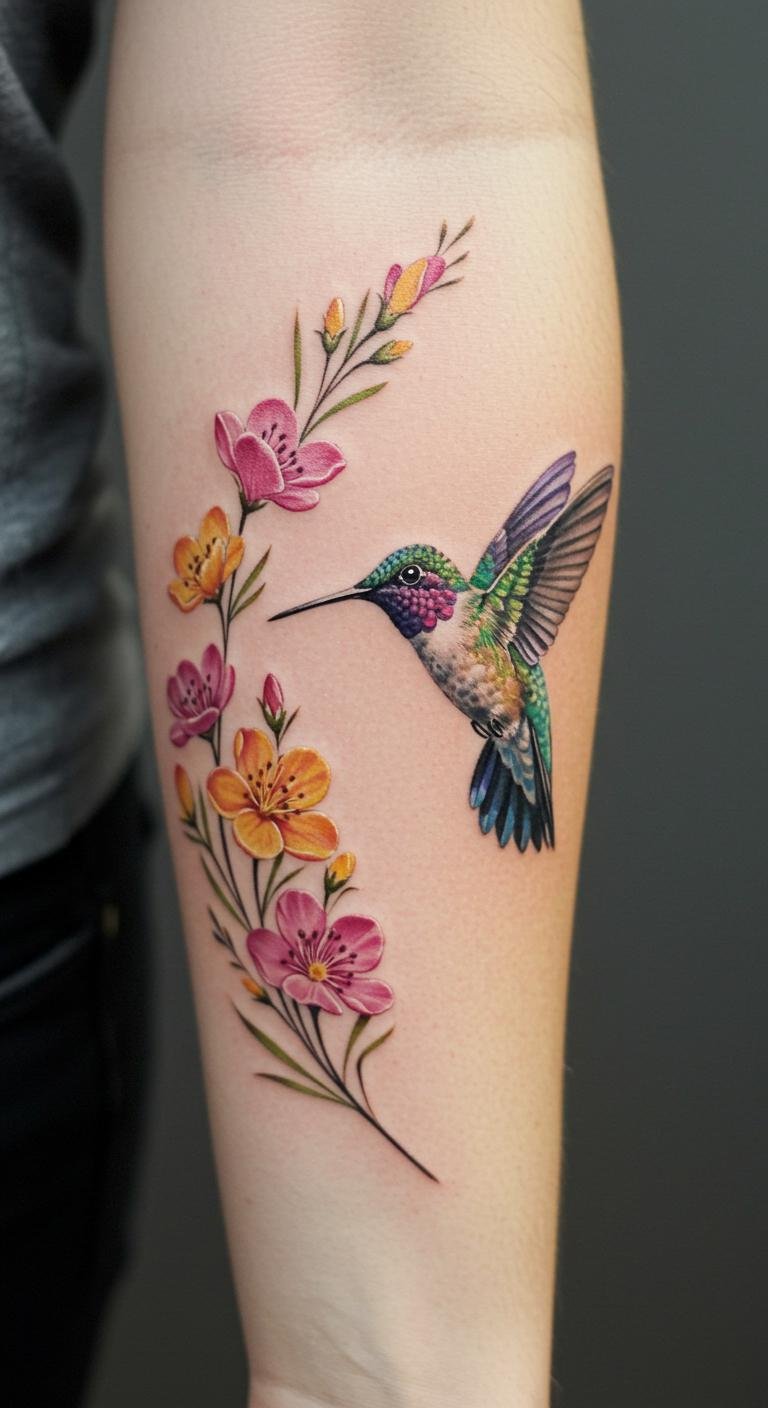 The combination of the hummingbird and flowers conveys a sense of harmony, vitality, and personal growth, making it a meaningful piece of body art.