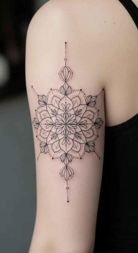 This mandala fine line tattoo embodies harmony and balance, symbolizing spiritual growth and mindfulness.