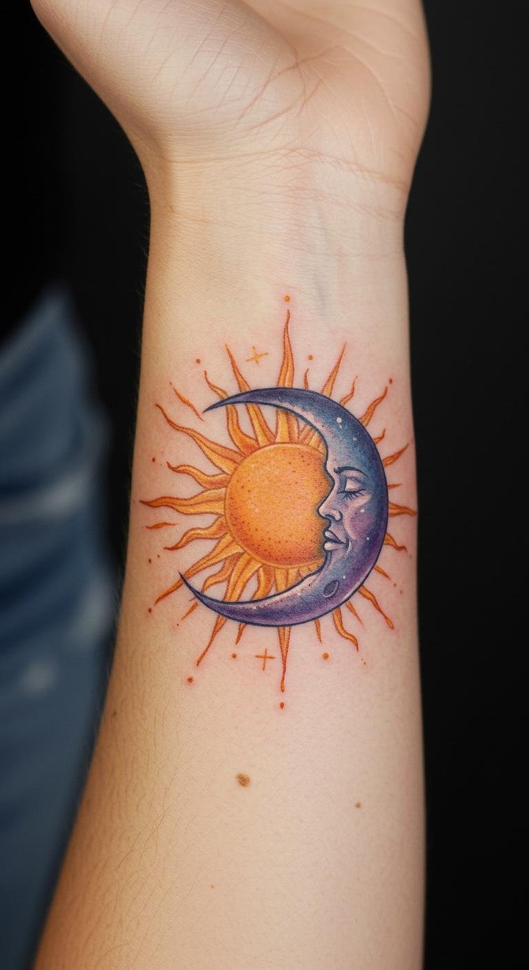 The sun embodies vitality and energy, while the moon reflects calm and introspection. Positioned on the inner forearm, it serves as a personal reminder of one’s journey and the harmony within, visible to the wearer yet intimate in its placement.