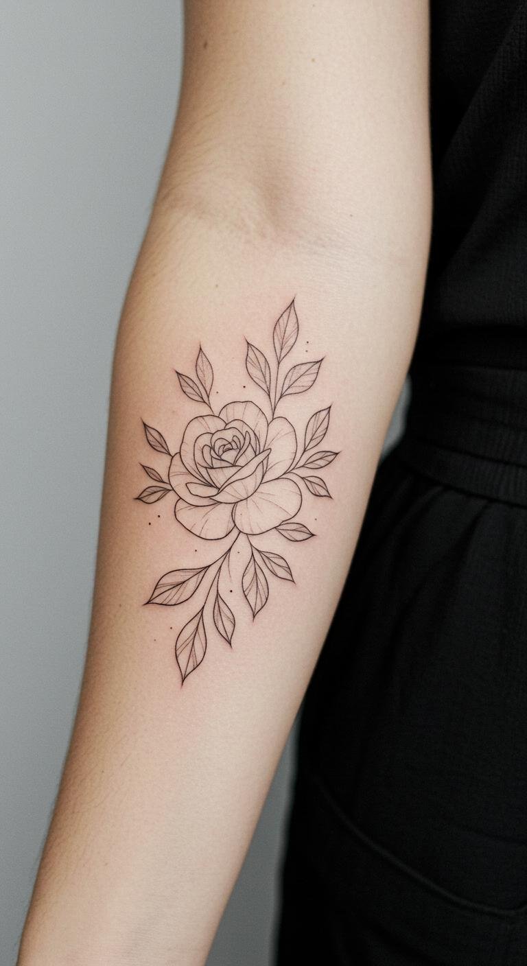 The rose symbolizes love and passion, while the leaves represent growth and resilience, making this tattoo a beautiful reminder of inner strength and emotional depth.