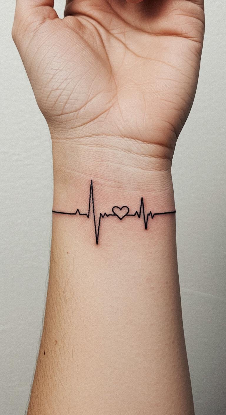 This heartbeat tattoo, placed on the wrist, symbolizes the essence of life and personal journey.