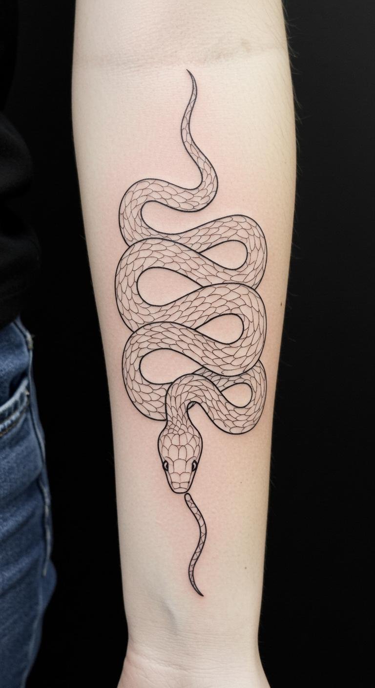 The placement on the forearm allows for personal visibility and easy expression of one’s journey. The snake, with its graceful form, dances around the arm, telling a story of resilience and growth, encouraging the wearer to embrace their unique path and experiences.